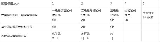 在文獻資料中和進口的化學試劑,有的等級與我國現行等級不太一致,下面將幾種常碰到的分級標準對照列表2-2供參考。