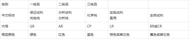 化學試劑在生產時,按用途不同制造出等級不同的規格,以供各使用單位按實驗要求選用。